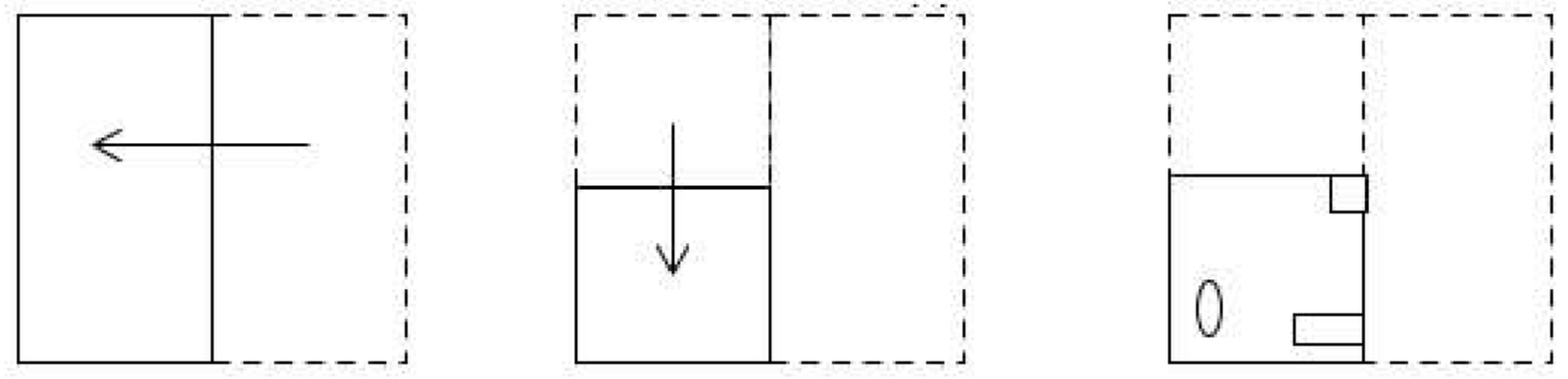 - The second fold is from top to bottom (horizontal fold). The bottom-left quadrant of the paper remains.